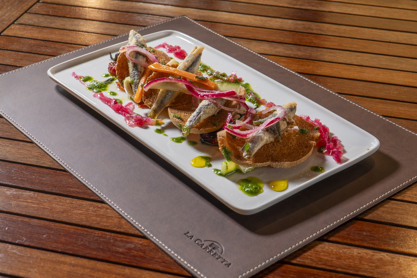 Pomodoro, acciughe del cantabrico, capperi, olive leccino, peperoncino, cipolla, olio agliato (1,7)