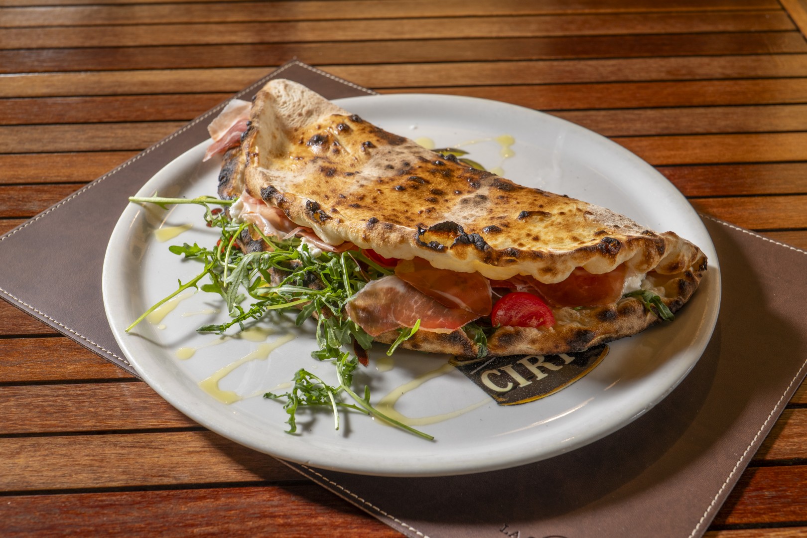 Pizza a portafoglio con mozzarella di bufala DOP, rucola, pomodori pachino, prosciutto crudo dolce di Parma 24M (1,7)