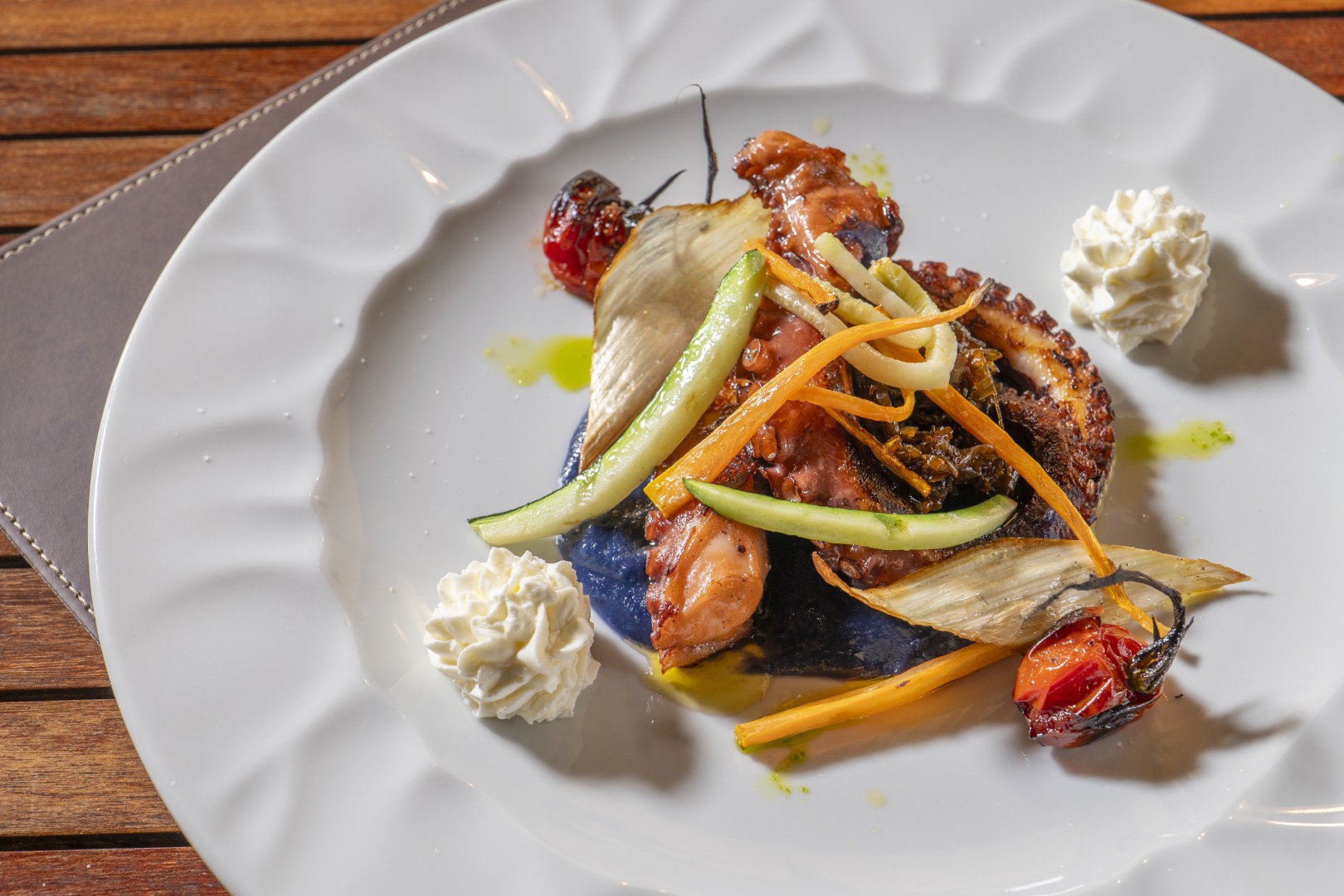 La granfia di polpo* con mantecato di cavolo viola, patata rossa, melograno, mousse di caprino e porro in agrodolce € 25,00